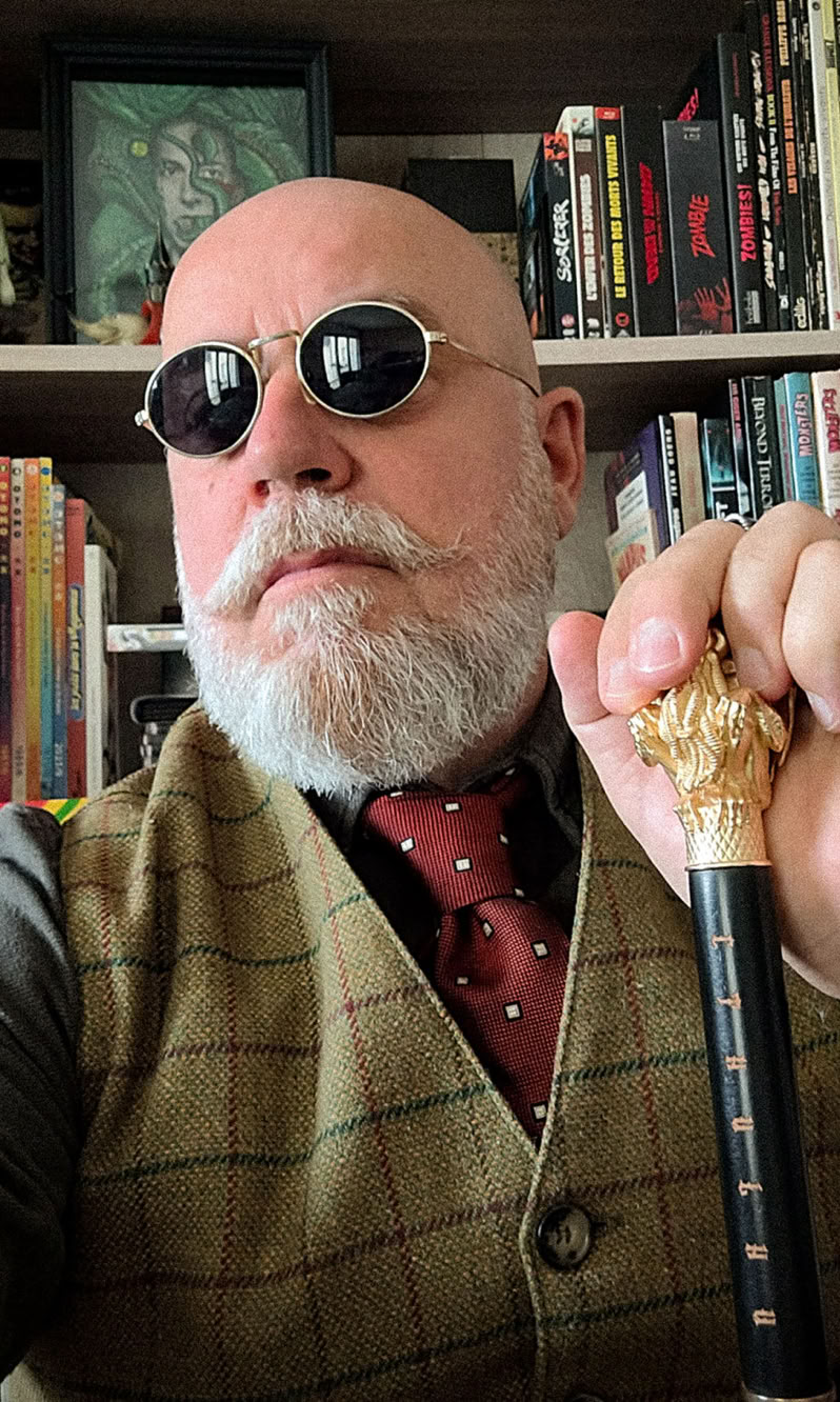 Géologue et biologiste de formation, monsieur Dagon, sevré d’une vaine chasse aux dinosaures qu’il espérait fructueuse et honorifique, s’oriente très vite vers la création artistique, prolongeant ses recherches académiques au travers de formes d’expression qui lui sont plus familières. Graphiste, peintre, illustrateur, vidéaste, il trouve son inspiration dans la trop souvent méprisée sous-culture, le cinéma de genre (de la Hammer au nanar le plus débridé), la littérature fantastique (H.P. Lovecraft, Jean Ray, R.E. Howard…) et la bande dessinée (E.P. Jacobs, Hergé, Tardi, Hugo Pratt…)